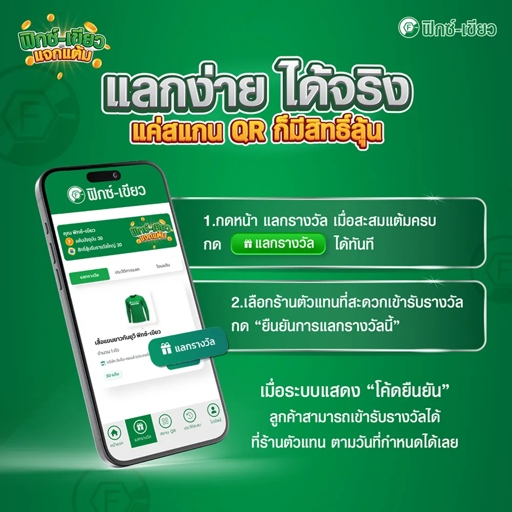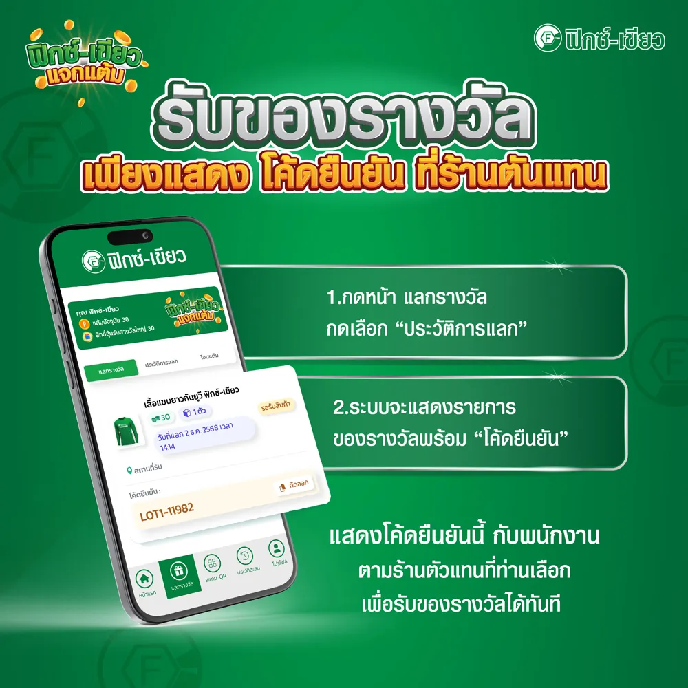 - บริษัทฯ ขอสงวนสิทธิ์ให้ลูกค้าที่แลกคะแนนรับเสื้อแขนยาวกันยูวี ฟิกซ์-เขียว รับเสื้อได้เฉพาะร้านที่ร่วมรายการที่เคยซื้อสินค้าเท่านั้น และคะแนนจะถูก หักตามจำนวนที่แลกรับจริง